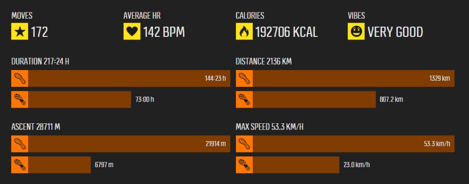 Matka: 1 329km / Nousu: 21 914m / Kesto: 144:23h