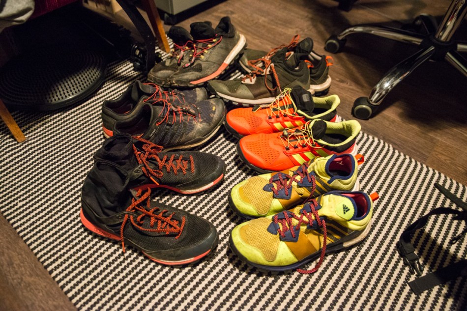 Nyt on suuri ongelma… Tai ei tää mikää suuri ole, mutta on pistänyt pääkoppaan ylimääräisiä pohdintoja. Eli olen Bodomin jälkeen alkanut miettimään kenkiä millä juosta Karhunkierroksen 53km. Olen jo talvella miettinyt, että juoksen tuon kisan varmasti Adidas Raven Boosteilla. Noilla kengillä juoksin viime vuoden polkumaratonit, joten luulis toimivan Karhunkierroksella. Ongelma on vaan siinä, että korkkasin tähän kauteen uudet Ravenit (kuvassa punaiset) ja ne eivät meinaa millään päästä sinuiksi jalkojen kanssa. Eli on ollut suuria ongelmia sisäänajon kanssa. Olen saanut kantapäät auki ja muutenkin rasittanut jalan kantapääosastoa. Tuntuu, että nuo kengät vaativat paljon enemmän sisäänajoa, kuin viime kauden Ravenit. Nyt olen päätymässä siihen, että lähden kevyemmillä ja vähemmän vaimennetuilla Adidas Adizero XT Boosteilla. Nuo kengät ovat toimineet loistavasti lyhyemmillä matkoilla ja viime sunnuntain 30km pitkis meni niillä loistavasti. Eli nyt suurella todennäköisyydellä lähden Adizeroilla, vaikka pitkään mietinkin Raveneita. Tietty viime kauden, melkein loppuun ajetut Ravenit ovat myös yksi vaihtoehto, mutta luulen keveyden voittavan tämän taiston ja lähden Adizeroilla.