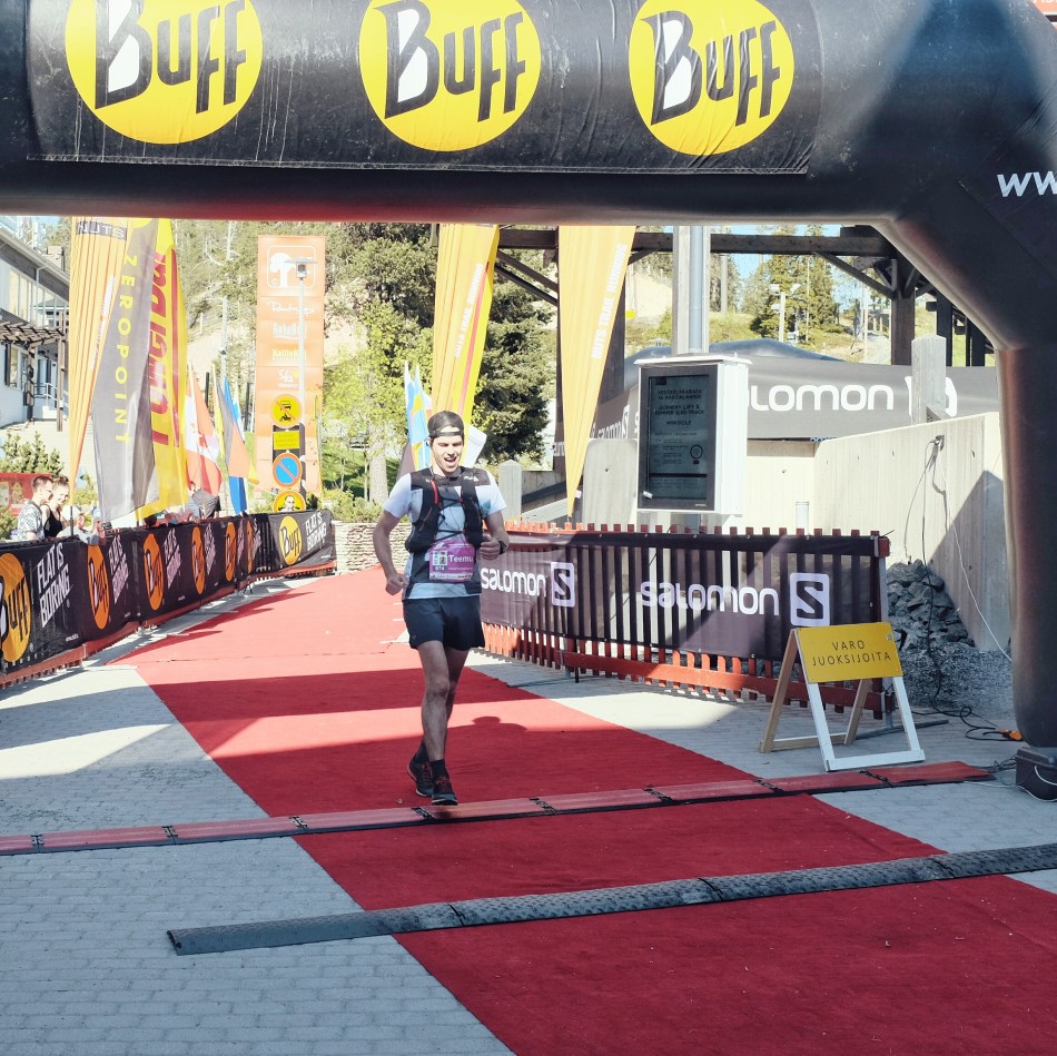 Kuulin kuuluttajan huutavan mikrofoniin, että Teemu Oksanen lähestyy maalia. Mietin vaan, että tsiigailiko se kiikareilla mäen huipulle vai miten se jo näin ajoissa huutelee mun nimeä. Anyway aivan mahtava fiilis tulla maaliin tuossa selostuksessa ja yleisön kannustuksessa. Saavuin punaisella matolle ja en voinut muuta kuin hymyillä. Fiilis oli niin loistava! En tuulettanut, mutta olin super iloinen ja liikuttunut! Ensimmäinen ultramatka takana!
