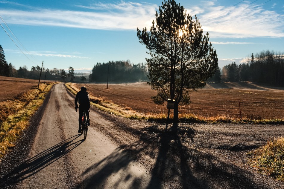 Viikirannan sillalla olin klo 8.00. Paikalle oli saapunut n. 20 pyöräilijää. Minulle tämä oli ensimmäinen kerta minkäänlaisella fillariyhteislenkillä. Katselin startissa muiden pyöriä, vaatteita, laukkuja jne. Tajusin olevani ainakin näissä asioissa oikeilla jäljillä. Itse olin pari viikkoa ennen tätä lenkkiä hankkinut uudet Panaracer GravelKing 40mm leveät gravel-renkaat. Huomasin monella muullakin olevan saman merkin renkaat. Taisi olla hyvä valinta. Mukanani oli myös isompi satulalaukku, jonne pakkasin pari kappaletta sisäkumeja, työkaluja ja vaihtovaatteita. Otin myös avaruushuovan mukaan, koska sääennusteet lupailivat vain muutamaa plussa astetta koko päivälle. Onneksi aurinko tulee lämmittämään niin kauan kuin valoa tulee riittämään. Viileä sää aiheutti pohdintaa myös vaatevalintoihin. Onneksi minulta löytyy Isadoren talvivaatteet, joten päätin laittaa ne päälle. Vauhti kun ei tule tällä lenkillä olemaan hirmu kovaa ja tuultakin on luvattu, niin lämpimästi vaan päälle. Isadorelta minulla oli jalassa Ovada Deep Winter trikoot. Yläkropassa aluspaitana Isadore Ovada Deep Winter merinopaita ja takkina Isadore Merino Membrane softshell. Kesäkengät päätin jättää kotiin ja jaloissani olivat vedenpitävät talvipyöräilykengät. Käsissä tupla hanskat, alla lämpimät Polartec alushanskat ja päällä tuulenpitävät hanskat. Kaulaa lämmitti fleece kauluri ja päätä Isadoren tuulen- ja vedenpitävä lippis, sekä Buff korvilla. Oikeastaan kaikki varusteet toimivat todella hyvin. Ainoastaan sormet palelivat muutaman kerran taukojen jälkeen. Onneksi nekin lämpesivät kun pääsi taas vauhtiin.