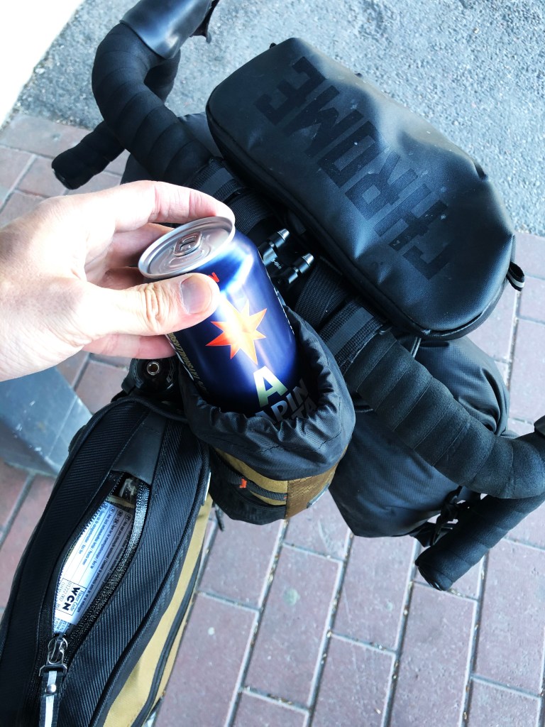 Viimeinen pit-stop ennen majapaikkaa oli Heinolan ABC:lla. Täytin siellä toisen pulloistani ja kävin ostamassa syötävää. Myös yksi palkinto-olut lipsahti ohjaustangon snack bagiin. Tämä tölkki tyhjenee sitten kun pääsen perille. Tässä vaiheessa matkaa oli takana 170 km ja edessä 30 km. Ilta oli upea! Yksi päivän hienoimmista osuuksista oli edessä. Ihailin vain auringonlaskua ja fiilistelin hiekkatien ropinaa. Välillä kurkkasin snack bagissä lämpenevää palkintoani. Ihan kohta pääset pois sieltä!