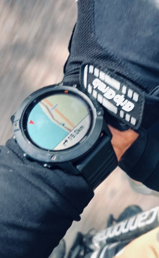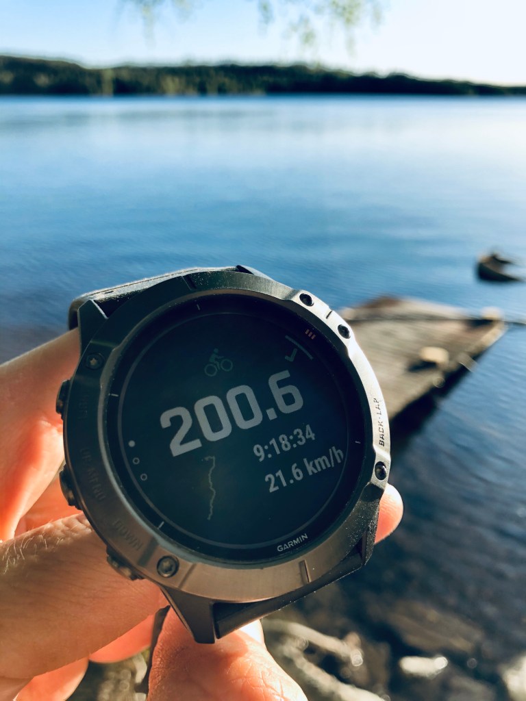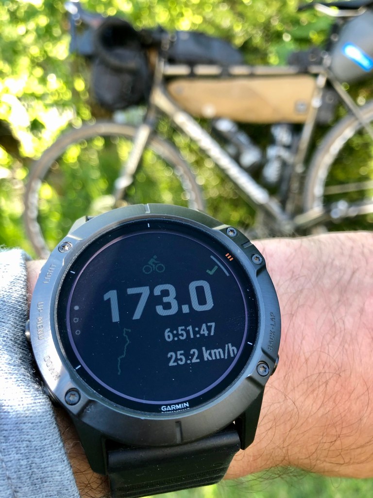 Navigoinnista ja retken tallentamisesta huolehti loistava Garmin fēnix 6X Pro Solar. En yleensä pyöräillessä pidä kelloa ranteessa, mutta tällä kertaa tanko oli jo täynnä laukkujen kiinnikkeitä, joten siellä ei enää ollut tilaa kellolle. Lisäksi kaupoissa käyntejä varten olisi aina joutunut irrotella kelloa pyörästä. Oli siis helpompaa pitää sitä ranteessa. Kartan seuraaminen on vähän haastavaa kun kello on ranteessa, mutta onneksi Garmin piippaa tai tärisee jos tulee käännös. Kello otti myös sykkeet ranteesta, joka karsi ahdistavan sykevyön.