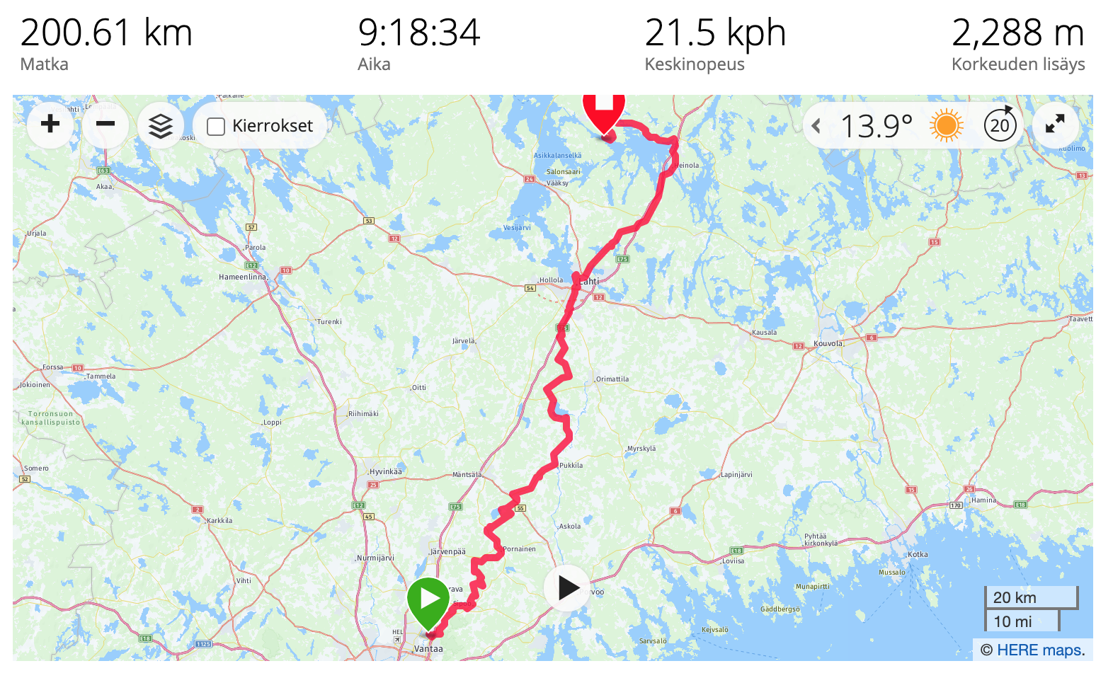 Hiekkatiet menivät todella maittavasti, vaikkakin nesteet alkoivat yhtä äkkiä loppumaan. Päivä oli jo tosi pitkällä ja mittari taisi näyttää jo n. 130 km. Enää ei olisi pitkä matka, mutta pakko jostain on vielä täyttää pullot. Saavuinkin sopivasti Järvenpäähän. Oli myös nälkä. Päätin palkita itseni Mäkkärin McVegan aterialla. Maistui. Sain myös toisen pulloista täytettyä. Ei ehkä fiksua täyttää juuri nyt mahaani näin paljoa, sillä seuraavaksi kurvaisin Vantaan Nikimäkeen kummityttöni synttäreille. Alunperin luulin, että en ehdi tuonne synttäreille, mutta myötätuuli ja hyvä kulku auttoivat aikataulun kanssa ja myöhästyin vain 30 min synttäreiltä. Oli mahtava fiilis mennä tapaamaan sukulaisia, vaikka tuoksuinkin tosi hyvälle. Onneksi juhlimiset tapahtuivat pääasiassa takapihalla. Vaikka maha olikin melko täysi mäkkärin jäljiltä, niin kyllä kakkua joutui santsaamaan ainakin pari kertaa.