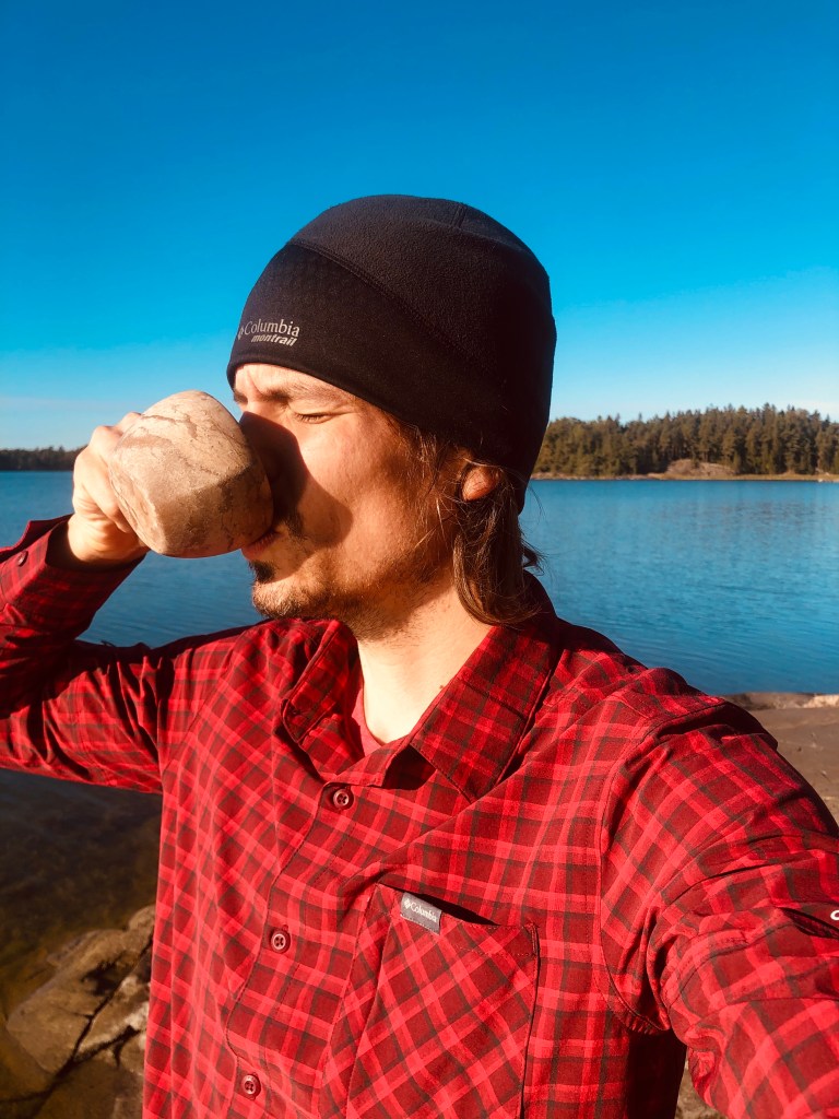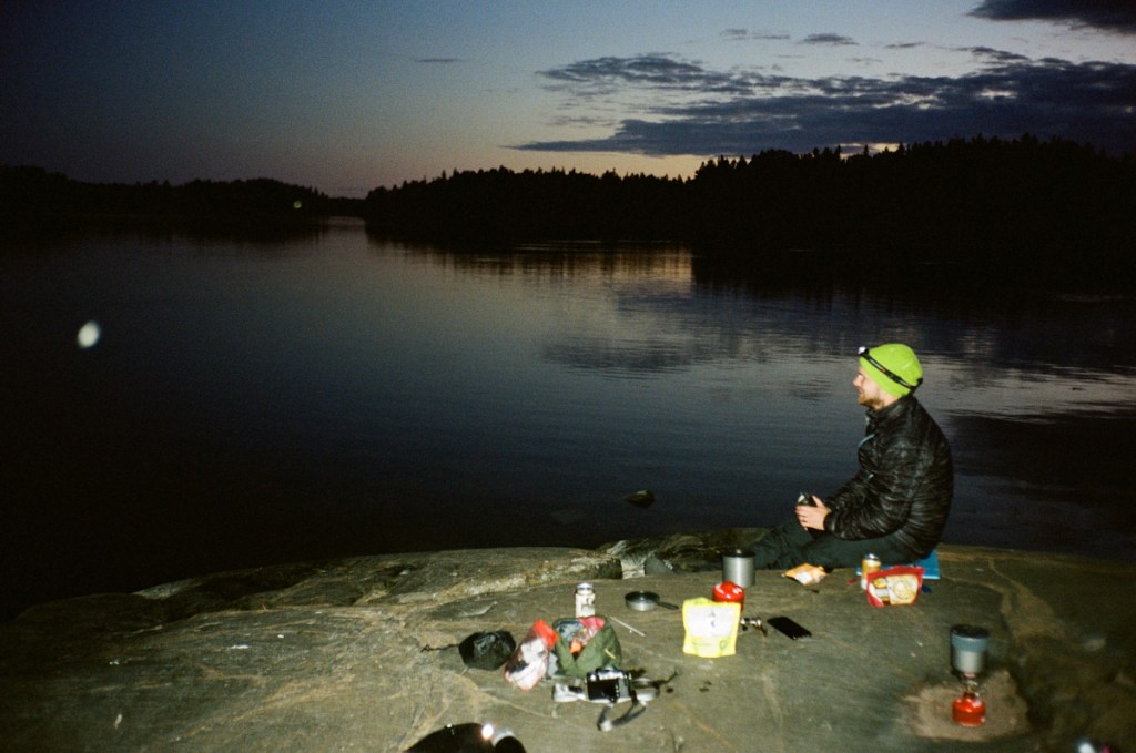 Tulipa nukuttua huonosti. Nukahtaminen venyi aika myöhään ja tunnin unien jälkeen heräsin vieressä nukkuneen Aleksin pyörimiseen. Myös joutsenet pitivät koko yön ihme meteliä. Kylläpä lähtee ärsyttävä ääni noin kauniista eläimestä! Aamu oli upea. Söimme aamupalan samalla kalliolla kuin iltapalan, auringon lämmittäessä. Noissa maisemissa pikakahvikin maistuu hyvältä!