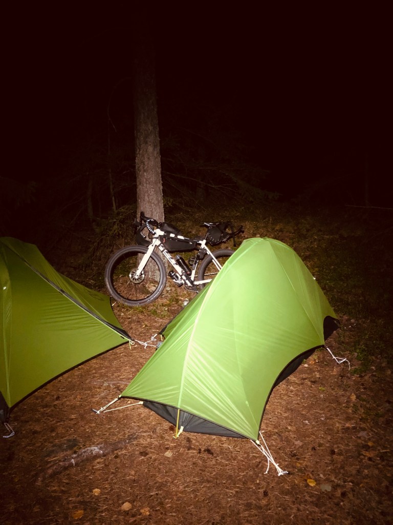 Väsy alkoi painamaan ja illan aikana alkanut vesisade jatkoi ripotteluaan. Oli aika painua telttoihin ja alkaa laskemaan lampaita. Jälleen yksi seikkailun täytteinen päivä takana! Tällä kertaa Garmin ilmoitti päivän päätteeksi lukemat 172 km. Yhteensä koko retkellä matkaa oli nyt kertynyt 1. päivä 165 km + 2. päivä 172 km = 337 km. Reittisuunnitelman mukaan viimeisenä päivä olisi edessä myös hieman yli 160 km, mutta kaikista haastavin maasto. Eli nyt oli syytä aloittaa lampaiden laskeminen hyvissä ajoin.