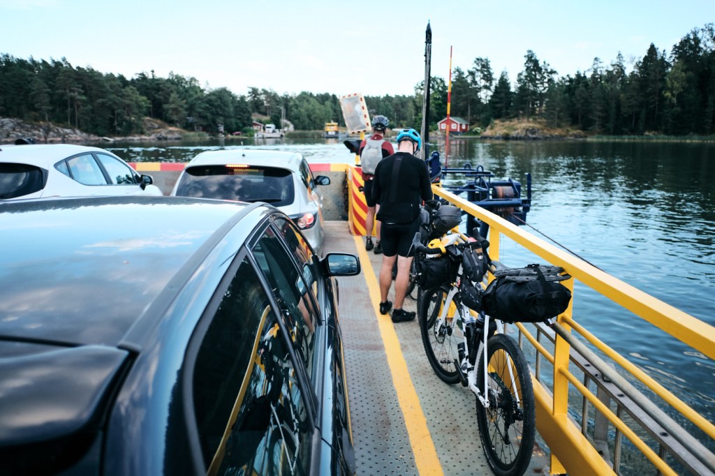 Lounastauon jälkeen jatkoimme kohti Inkoota. Vähän jouduimme kurkkimaan kelloa ja laskeskelemaan leiriin saapumisaikaa. Näyttäisi siltä, että ehdimme ennen pimeää. Ajoimme jonkin matkaa ison tien varrella. Aleksi vanhana maantiekisaajana opetti meille miten ajetaan porukassa. Vuorovedoin ajoimme kohtuu kovaa kohti Inkoota. Sitten koukkasimme vielä pienille hiekka- ja asfalttiteille. Lopulta olimme Inkoossa. Oli aika ostaa iltapalaa leiriin. Yllättäen ruuan lisäksi kaikille tarttui muutama purkki olutta matkaan. Ihastelimme Paulin kanssa kun Aleksi pakkasi kaikki ostokset hänen upouuteen Apiduran pieneen tilaan pakkautuvaan reppuun. Oli muuten kätevä. Seuraavalle retkelle otettava joku vastaavanlainen. Inkoon kaupalta oli vielä n. 10 km matkaa leiriin. Tuo etappi oli asfalttia. Pojat painoivat hienosti edellä ja minä roikuin jotenkin mukana. 650b renkaat alhaisilla paineilla eivät oikein loistaneet asfaltilla. Onneksi tajusin myöhemmin retkellä lisää ilmaa renkaisiin. Asfalttitie tuli päätökseen ja edessä oli meri. Toisella puolella rantaa lossi lähti kohti meidän puolta. Hetkeksi pyörät parkkiin ja odottelemaan lossia. Pienien minuutti määrien hengailun jälkeen lossi oli meidän puolella ja oli aika rullata sen kyytiin. Lossimatka oli lyhyt, mutta todella siisti kokemus! Upeat maisemat ja lossi toi päivään oman leimansa. Vastarannalla ajoimme lossista ulos ja heti alkoi luksus hiekkatie. Sivulla oli pelto ja ai, että miten upea näky pellolla oli. Peura perhe tuijotteli meitä kun soratie rohisi allamme. Hetken tuijottelun jälkeen peurat lähtivät juoksemaan saman suuntaisesti meidän kanssa. Huh huh, mikä näky ja fiilis!