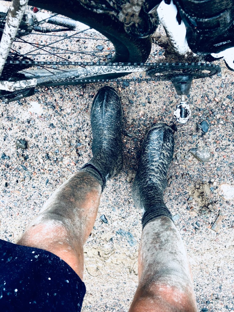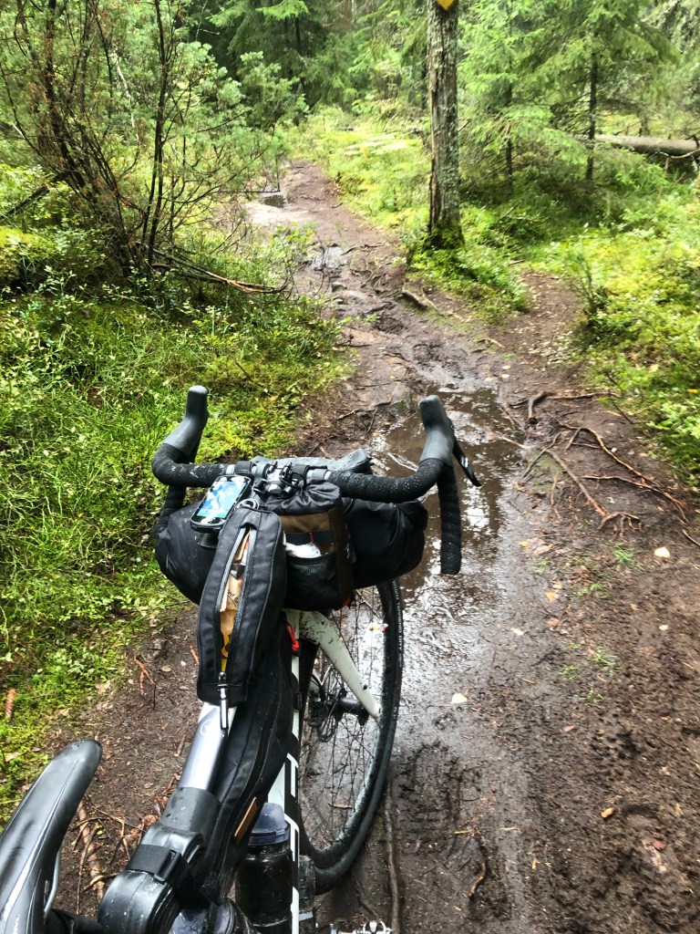 Kasasimme märät teltat ja pakkasimme pyörät. Tällä kertaa päivän pyöräilyt aloitettiin sadetakki päällä. Vettä tihutteli silloin tällöin kevyesti ja sääennuste lupaili sateita pitkin päivää. Mutaa ja märkää menoa oli tiedossa! Jälleen kerran päivä käynnistyi aika rauhallisesti, koska ajoimme n. 10 km päässä sijaitsevalle ABC:lle aamupalalle. Leirissä ruokavarastomme oli aika pienet ja olimme tutkineet, että läheltä löytyy ABC joten sinne syömään kunnon aamupala. Huoltsikalla toista kahvikuppia hörppiessä huomasimme kuinka vesisade yltyi aikamoiseksi rankkasateeksi. Aamupalan jälkeen tarkkailimme hetken sateen etenemistä ja eihän se mihinkään ollut katoamassa. Nyt piti vaan sukeltaa vesisuihkuun ja jatkaa matkaa. Ajoimme muutaman kilsan maantien reunalla nauttien vesisuihkusta. Pyörissämme valot vilkkuivat ja vesisuihkusi takarenkaasta. Nyt koiteltiin ukkoja. Kaipasin hiekkateille keskelle metsää. Siellä saisi suojan tuulelta ja vauhti olisi hiljaisempaa. Ei mennytkään kauaa kun saavuimme todella upealle hiekkatielle. Todella hienoa maalaismaisemaa ja välillä pääsimme puiden suojaan. Sadetakki alkoi tuntua jo liian lämpimältä ja vaihdoin tuulitakin päälle. Vettä tihutteli vieläkin, mutta tuulitakki tarjoisi nyt kaivattua tuuletusta. Oli aikamoista tasapainottelua ylikuumenemisen ja palelun välillä. Lopulta tuo tuulitakki tarjosin kaikista parhaan ratkaisun. Lämpötila oli +13 astetta.