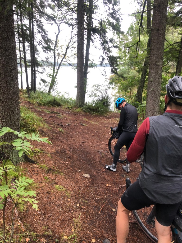 Vielä ennen Espoon tuttuja hiekkateitä pääsimme kokemaan aikamoisen järkytyksen. Jälleen kerran kompastuimme meikäläisen vähän huolimattomaan reittisuunnitteluun. En ollut taaskaan kattonut seuraavaa etappia tarpeeksi tarkkaan. Saavuimme metsätien päähän ja edessämme näkyi vain järvi ja teknistä polkua. Samalla vastaan tuli tuttuja polkujuoksukavereita. Kysyin heti, että missä me ollaan. Vastaukseksi tuli Meiko. Samantien tajusin, että nyt tulee olemaan haastava etappi edessä. Tutkin karttaa ja näin reitin menevän Meikojärven rantaa pitkin. Pari vuotta sitten juoksin täällä polkujuoksukisassa ja muistin samantien, että reitti tulee tästä eteenpäin jatkumaan todella juurakkoisena. Se tiesi pitkää taluttamista. Tässä juurakossa ei näillä pyörillä poljeta. Mutta takaisin päin ei käännytty. Itsellä on aina ollut se periaate, että takaisin en käänny, sillä useasti reitti kuitenkin muuttuu jossain vaiheessa parempaan. Myös palaaminen ja uuden reitin selvittely tulee viemään paljon aikaa, joten viisainta jatkaa alkuperäistä suunnitelmaa. Jos ei ole kiirettä, niin pieni kävely maistuu aina. Tällä kertaa kävely kesti n. 2,6 km yhdellä Etelä-Suomen teknisimmistä poluista. Suosioni Aleksin ja Paulin silmissä ei ollut tällä hetkellä huipussaan.