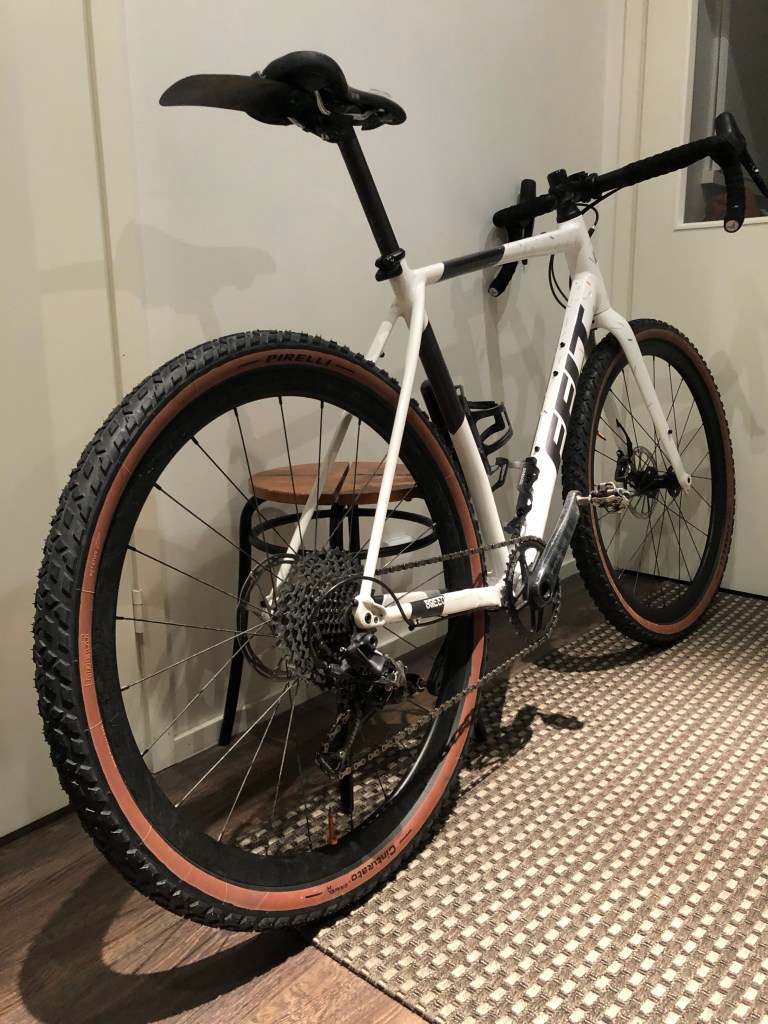 + Alumiininen runko. Tämä on vähän molempia, plussaa ja miinusta, mutta minulla alumiinirunko menee enemmän plussan puolelle. Meikäläisen gravel säheltämisessä kestävyys tulee keveyden edelle. Hiilikuitu runko olisi minulla saattanut olla jo palasina. On myös sanottu, että hyvä alumiinirunko on parempi kuin halpa hiilituinen. Lisäksi hiilikuitu rungon valmistaminen vaatii käsityötä ja siksi on huomattavasti kalliimpi. Alumiini sopii paremmin meikäläisen kukkarolle. Hiilikuitua taas kaipaisi sen tuoman tärinän vaimennuksen ja jäykkyyden puolesta.