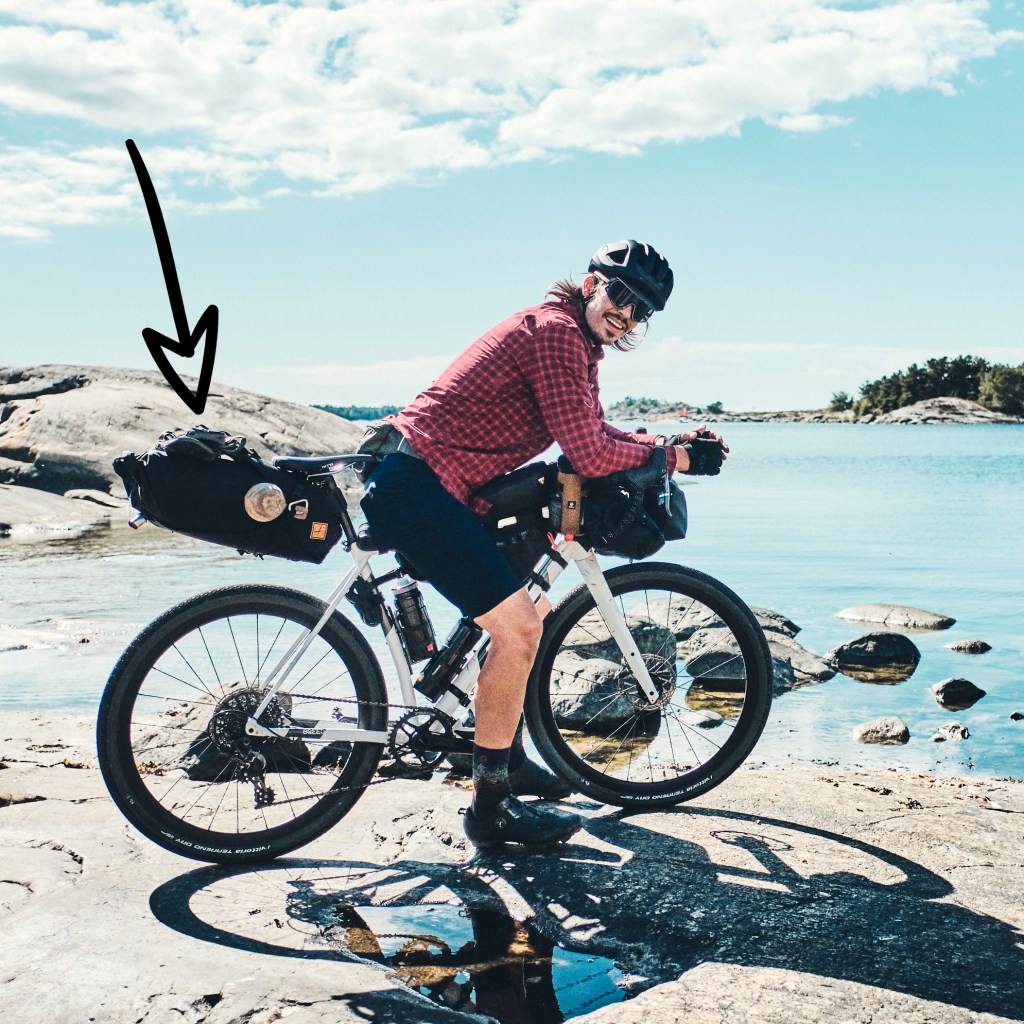 Vaatteita – Leirivaatteet (shortsit/kevyet housut + paita + merinokalsarit + hattu), kevytuntuvatakki aka taukotakki, vaihtovaatteita. Samoilla pyöräilytrikoilla pärjää useamman päivän, mutta ajopaitoja hyvä olla ainakin yksi varalla. Sadevaatteet laukun suuaukolle (tai ajopaidan taskuihin).