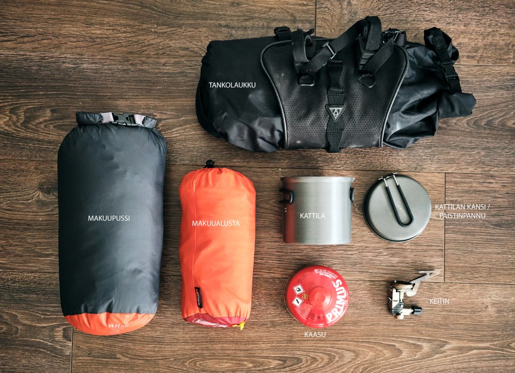 Retkeilyä on tullut harrastettua jo yli 10 vuotta. Rinkka selässä on tullut kierrettyä pohjoisen kaikki tunnetuimmat reitit. Nuo reissut tuli siis aikoinaan tallusteltua hiljaksiin jalan. Olen kuitenkin aina ollut kiinnostunut pitkien matkojen etenemisestä vauhdilla. Sen takia rinkkaretkeily muuttui aikoinaan polku-ultrajuoksuksi ja nyt sen rinnalle on tullut pyöräretkeily. Näiden retkien kautta olen saanut hyvän opin mitä ja miten kannattaa pakata retkille mukaan. Ensikertalaisille varustemäärä ja niiden sijoittelu laukkuihin saattaa tuntua todella haastavalta. Valintoja helpottaakseen Addnature.fi pyysi minua antamaan vinkkejä ja listaamaan omia suosikkivarusteitani pyöräretkelle. Toivon tämän artikkelin helpottavan ensimmäiselle pyöräretkelle lähtöä ja ehkä kokeneemmatkin retkeilijät saavat tästä jotain uutta. Tätä kirjoitusta lukiessa on hyvä huomioida, että pyrin retkilläni pitämään kohtuullisen hyvää vauhtia ja kulkemaan päivän aikana pitkiä matkoja. Eli en ole ns. naatiskelija retkeilijä joka pakkaa pyörälaukkuun paistinpannun ja puolijoukkueteltan. Pyrin liikkumaan mahdollisimman kevyellä ja kompaktilla varustuksella, kuitenkin riittävän kattavalla etten joudu vaikeuksiin.