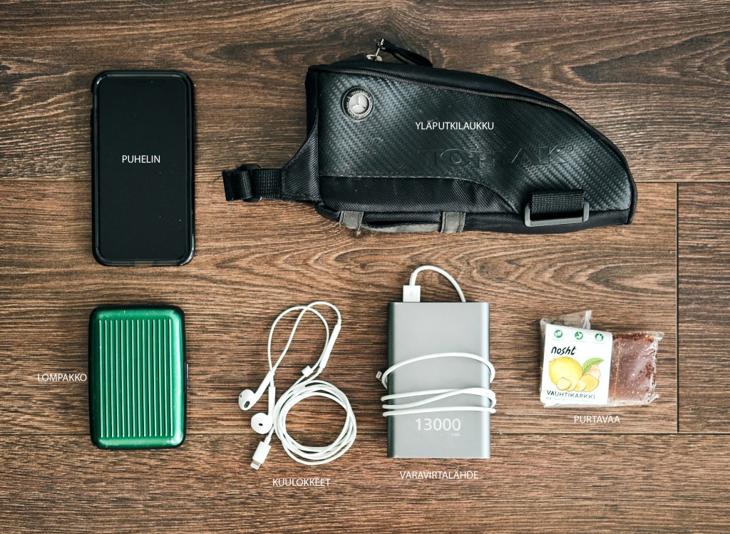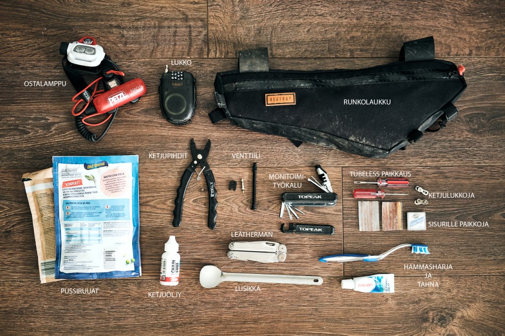 Työkaluja – Monitoimityökalu, rengasraudat, ketjun katkaisija, ketjulukko, tubeless paikkoja, pinna-avain, varaventtiili, ketjulukon pihdit tai pätkä kaapelia, jesaria (teippaa esim. pullon ympärille ja ota siitä korjaamiseen jos tarvetta), Leatherman (puukko, pihdit, sakset), nippusiteitä. Eli kaikki työkalut joilla voit välttää liftauksen. Jos esim. pussiruuat valtaavat runkolaukusta kaiken tilan, niin työkalut voi sijoittaa esim kolmannen pullon sisälle. Minulla tuo kolmas pullo sijaitsee alaputken alapuolella.