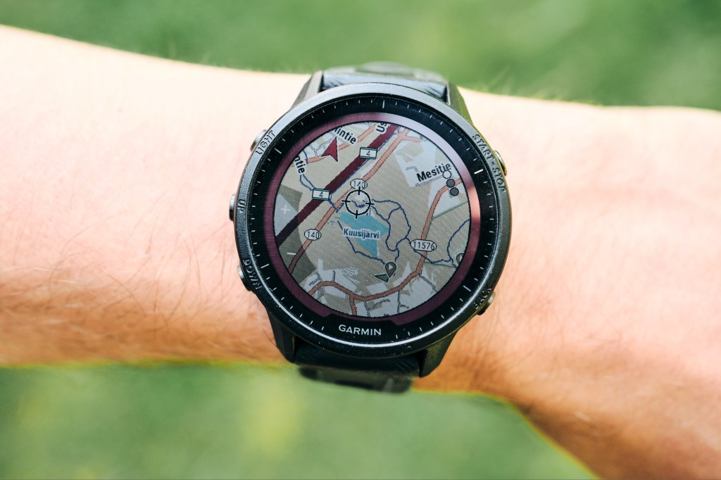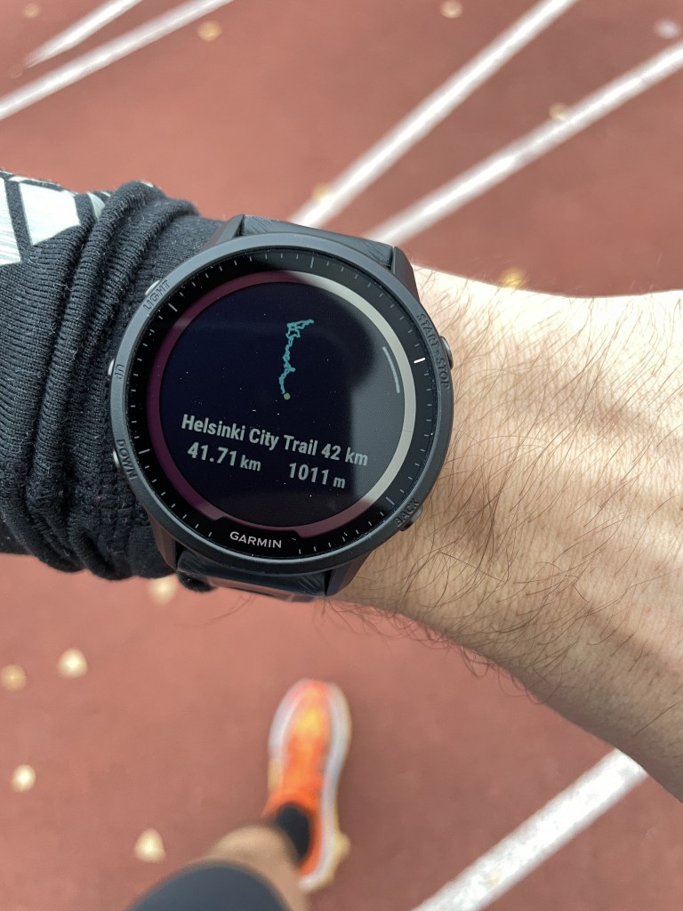 + Kartat. Garminissa on erittäin selkeät kartat ja navigointi on helppoa. Syksyllä juoksin maratonin Helsingin keskuspuistossa ja siellä reitti kiemurteli ja polut risteilivät. Ilman Garminiin ladattua reittikarttaa olisin saattanut monesti kääntyä väärälle polulle.